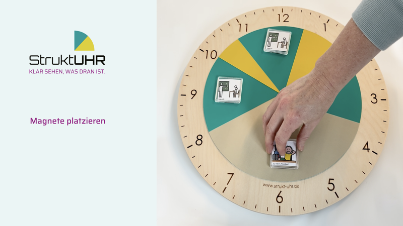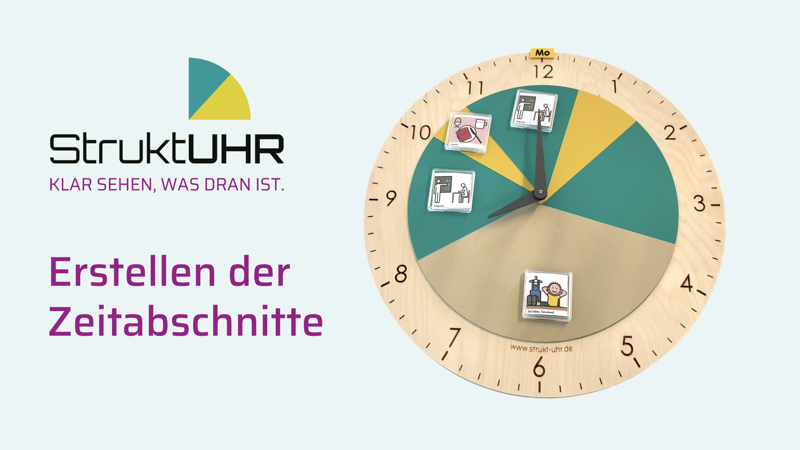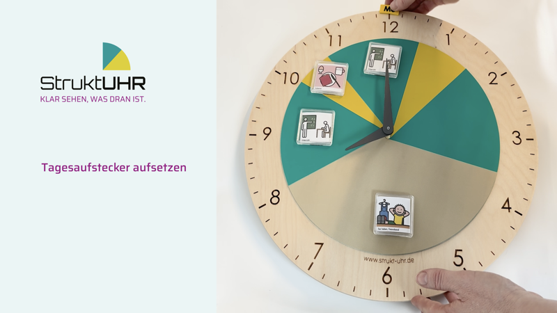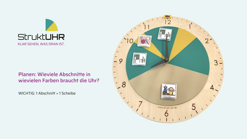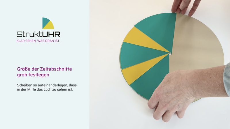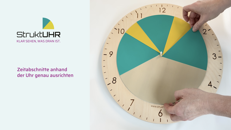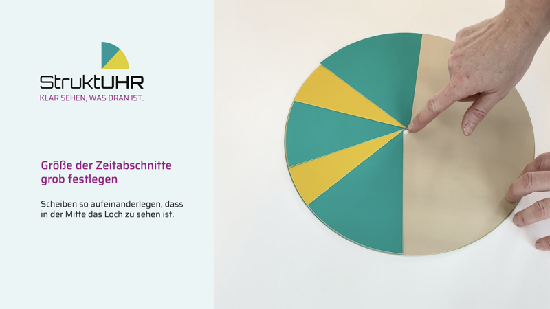 Die StruktUHR wird individuell an den jeweiligen Tagesablauf angepasst. Durch das Zusammensetzen der farbigen Scheiben entstehen klar erkennbare Zeitabschnitte, die Orientierung und Sicherheit geben. So wird sichtbar, wann ein Abschnitt beginnt und wann er endet. Mit etwas Vorbereitung lässt sich die gewünschte Tagesstruktur Schritt für Schritt zusammenstellen und anschließend auf dem Uhrwerk ausrichten. Die folgenden Abbildungen sowie das Erklärvideo zeigen den genauen Ablauf und unterstützen bei der Einrichtung.