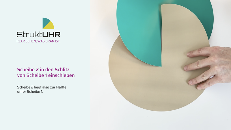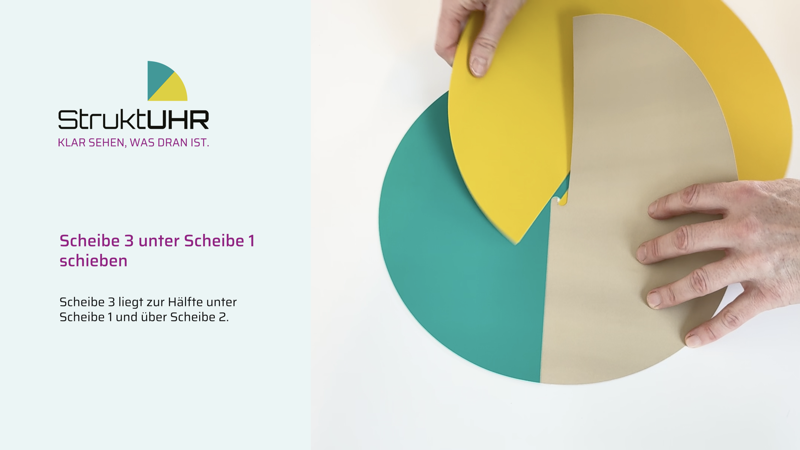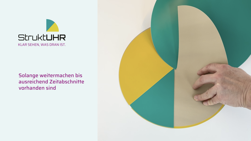 Für dieses Beispiel benötigen Sie also insgesamt 6 Scheiben, es bietet sich an, die Arbeitsphasen in einer Farbe zu planen (3x z.B. türkisgrün) und die Pausen ebenfalls in einer Farbe zu planen (2x z.B. gelb). Für den Feierabend nehmen Sie dann eine weitere Farbe Ihrer Wahl. Das Zusammenstecken der einzelnen Scheiben sehen Sie im Erklärvideo oder in der Bilderanleitung. Mit diesen Tipps schaffen Sie es schnell, die StruktUHR den individuellen Bedürfnissen anzupassen.
