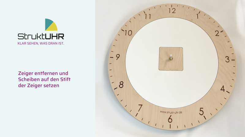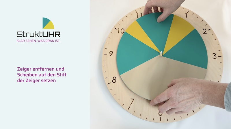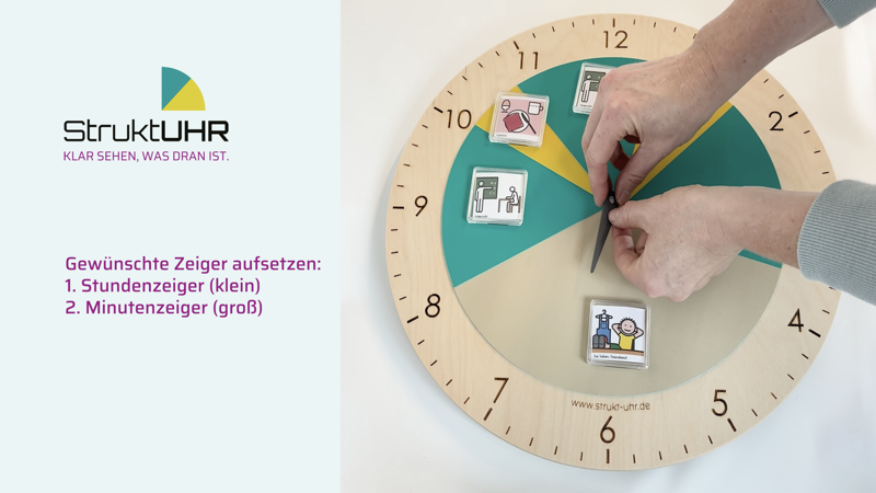Bereits im Lieferumfang sind insgesamt 4 Zeigersets beigefügt. Diese können beliebig aufgesteckt werden. Oder es kann auch nur der Minuten- oder Stundenzeiger gesteckt werden, wenn Sie z.B. eine Therapiestunde auf der StruktUHR darstellen möchten.